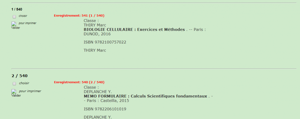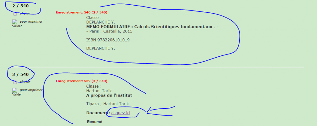 وبعد القيام بعملية البحث في قاعدة البيانات نكون النتيجة بداية ظهور البطاقات البيبليوغرافية الخاصة بمجموعة الكتب الموجودة داخل المكتبة.