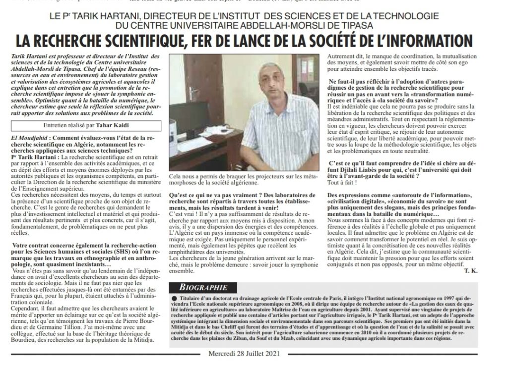 Ayant supervisé une vingtaine de projets de recherche appliquée et publié une centaine d’articles portant sur l’agriculture irriguée, le Professeur Tarik Hartani est un adepte de l’approche systémique intégrant la dimension sociale et environnementale dans son parcours scientifique.