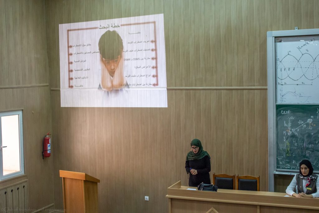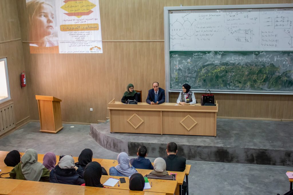 نظم نادي الهندسة والتكنولوجيا يوم دراسي حول تشخيص إضطراب طيف التوحد بحضور مجموعة من أساتذة معهد العلوم وأساتذة معهد العلوم الإجتماعية والإنسانية والمستشارة الدكتورة لبنى قدور المختصة في علم النفس العيادي يوم 20 فيفري 2019 بمعهد العلوم للمركز الجامعي مرسلي عبد الله.